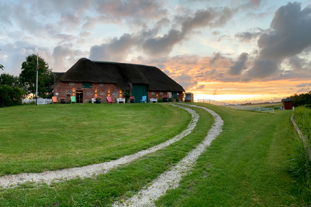 Mit dem Rad geht es gemütlich durch die saftig grüne Landschaft, vorbei an alten und urigen Friesenhäusern, dem roten-weißen Leuchtturm und kleinen Sielzügen, die in der Abendsonne orange bis tiefrot schimmern. Der Deich ist umgeben mit unzähligen Schafen. Der Deich auf der Insel ist unvergleichbar und einzigartig. Kein Wunder, denn dieser führt einmal komplett rund um die Insel!