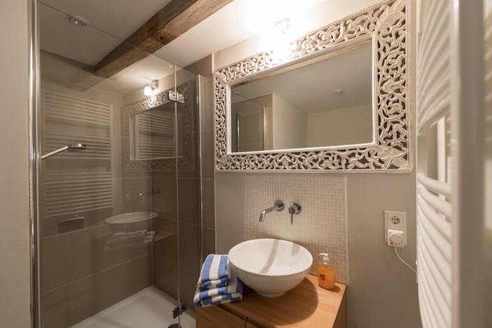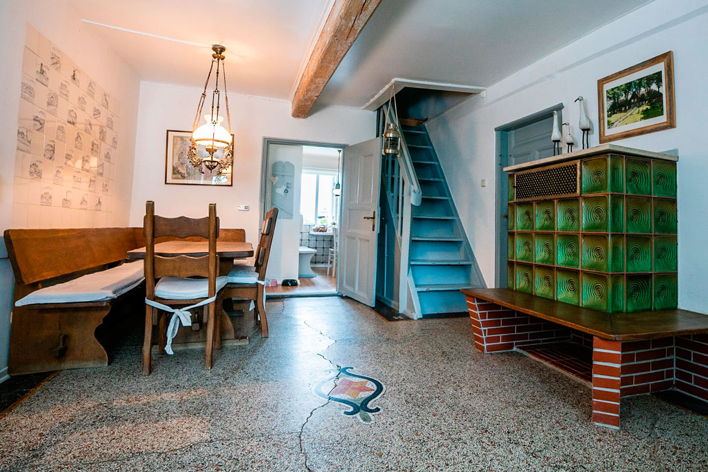 Das Apartment ist mit Holzdielen ausgelegt, in der Essdiele liegt ein alter Mosaikboden.
