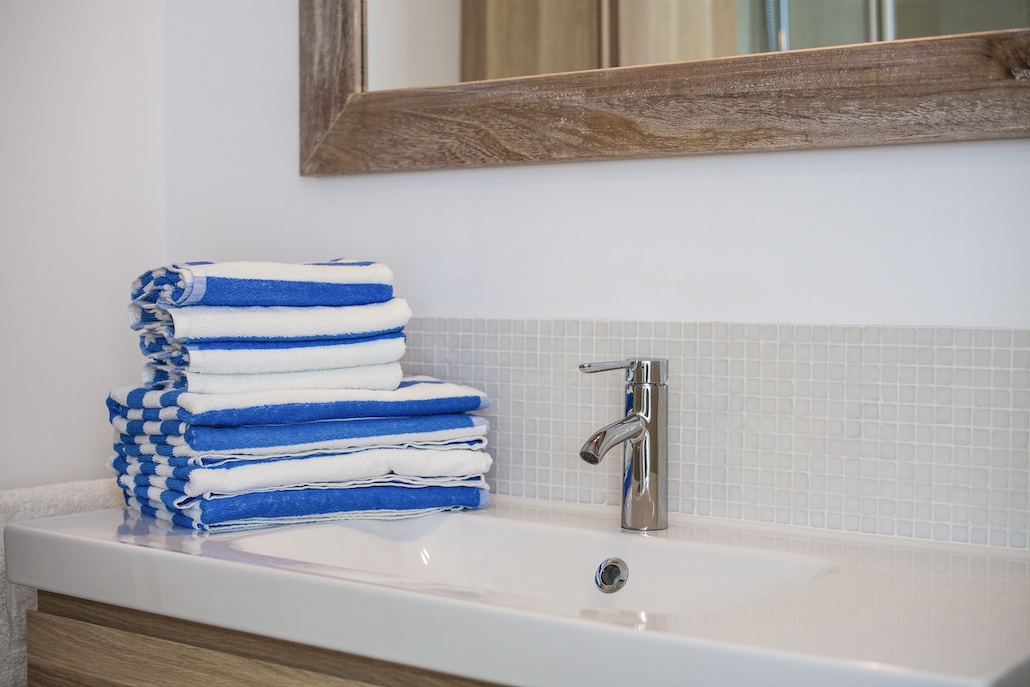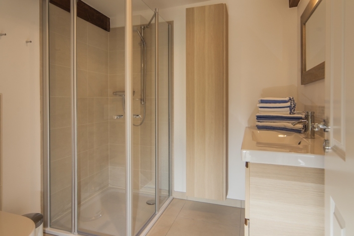 Das Bad hat eine ungewöhnlich große Dusche für eine Ferienwohnungen. Es gibt ausreichend Abstellmöglichkeiten für Kosmetika. Angenehm ist auch das zusätzliche Gäste WC. Unseren Kindern hat besonders gefallen, dass ihr Schlafzimmer nicht direkt neben unserem war, und es keine Streitigkeiten über die Lautstärke des PCs gab.