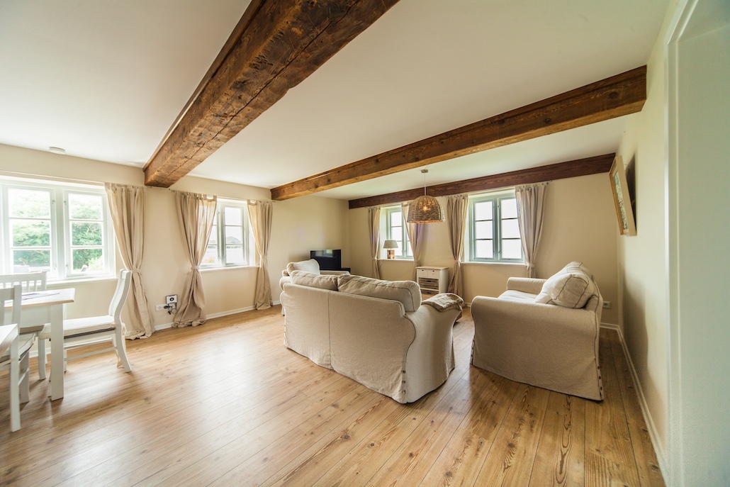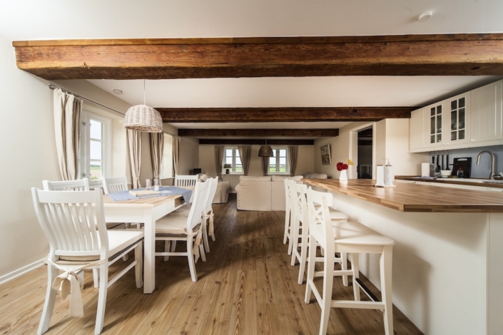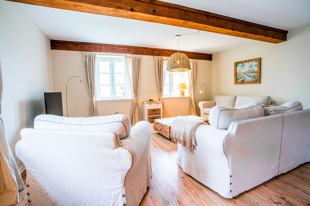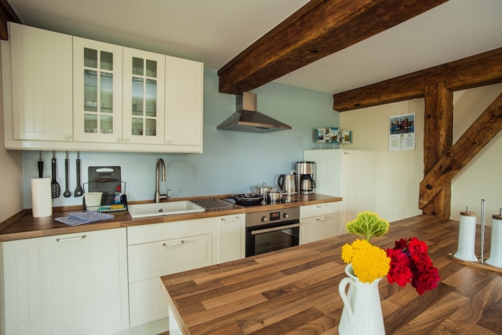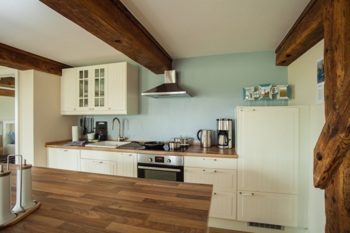 Die Wohnung ist wunderbar. Zwei Schlafzimmer mit bequemen Betten, dazu ein Kinderbett in einer Nische, die Abstand und Nähe zu den Eltern besitzt. Die Sanitärbereiche sind sehr sauber, modern und praktisch eingerichtet, ebenso die im Wohnbereich integrierte Küche. Das Wohnzimmer ist sehr groß und kann daher die Küche, einen großen Küchen-Esstisch, einen weiteren Esstisch und die großzügige Sitzecke mit TV aufnehmen, ohne im geringsten überladen zu wirken. Die Sitzmöbel sind sehr bequem und die ganze Innenausstattung ist nicht nur qualitativ hervorragend sondern auch geschmacklich ganz toll abgestimmt. Das fängt bei den Teppichen an, setzt sich über die Möbel und Lampen fort und endet bei den Gardinen und Accessoires. Besonderen Reiz haben natürlich die alten, sichtbaren Deckenbalken. Die Küche ist mit allem ausgestattet, was man braucht und zwar in sehr guter Qualität.